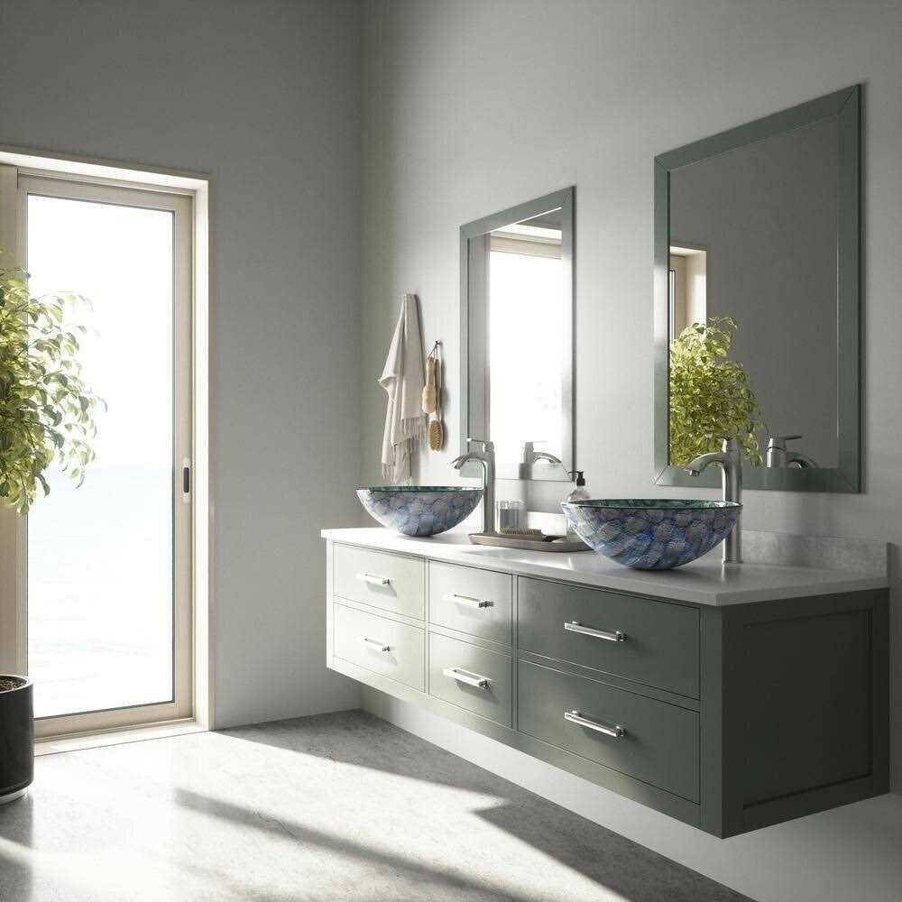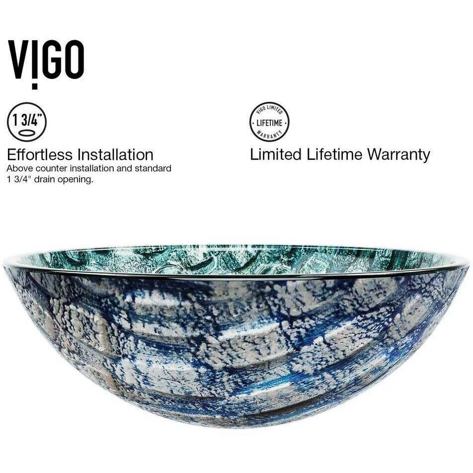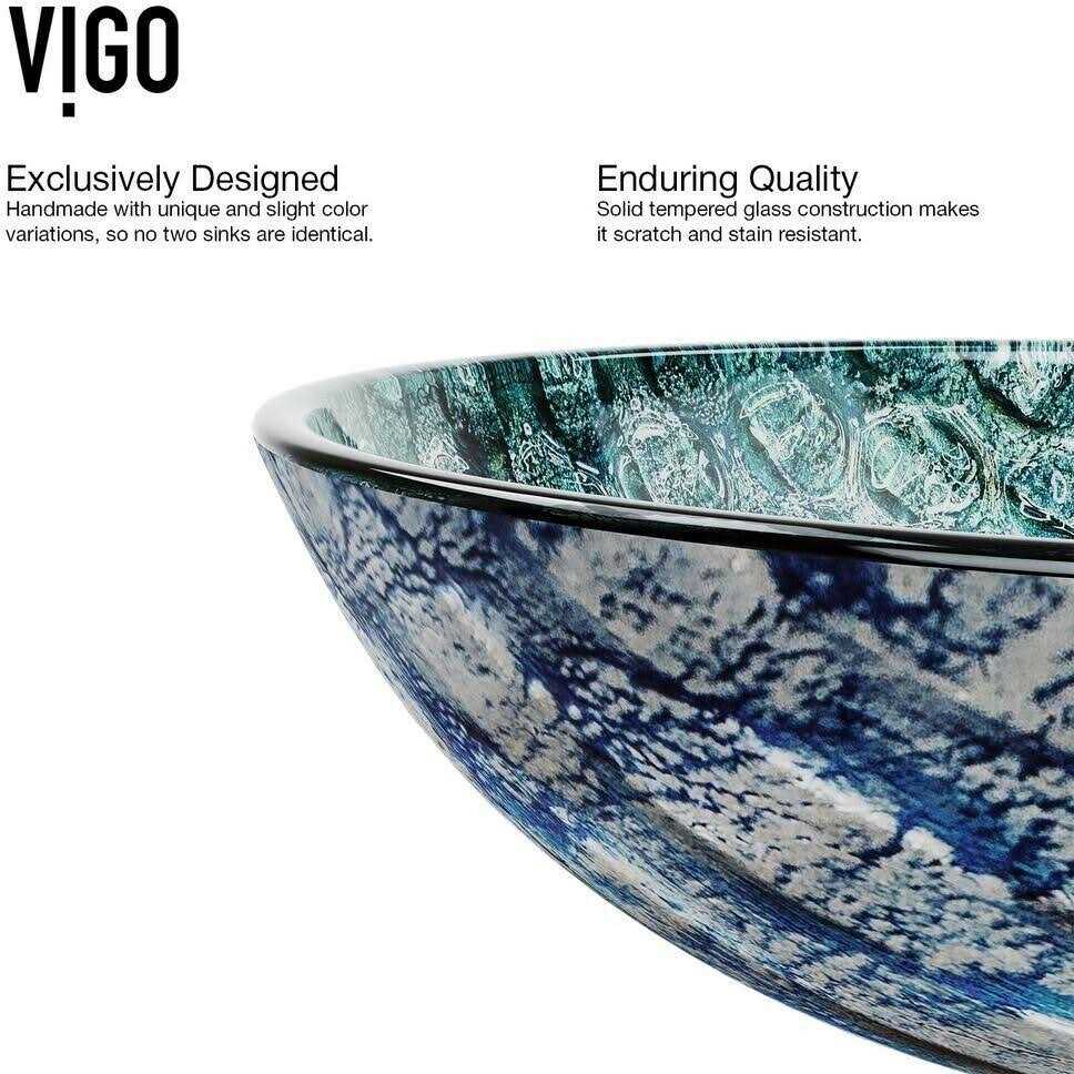 Vigo Oceania Glass Vessel Sink. Features: Imagine ocean blue waves in your beachy bathroom. The gorgeous Oceania vessel sink by Vigo mixes aqua blue and sea green on a wavy pattern to bring the ocean to your bathroom. The Oceania glass vessel sink features aqua blue, and sea green colors in a wave-like pattern, bringing the ocean to your bathroom.. Handmade with possible unique and slight color variations, so no two sinks are identical. Solid tempered glass construction. Scratch-resistant interior glass. Non-porous surface prevents discoloration and fading. Stain-resistant, easy-to-clean surface. Polished glass interior with textured exterior. 1.75 in. standard drain opening. Sink measurements. Diameter – 16 0.5 in. Height – 6 in. Glass thickness – 0.5 in.