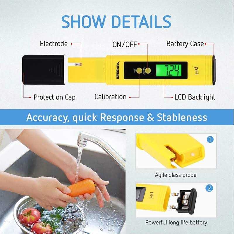 • What You Get: VIVOSUN pH meter, user manual, 2 x 1.5V button cells (built in), 3 x pH buffer powders