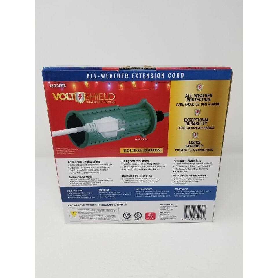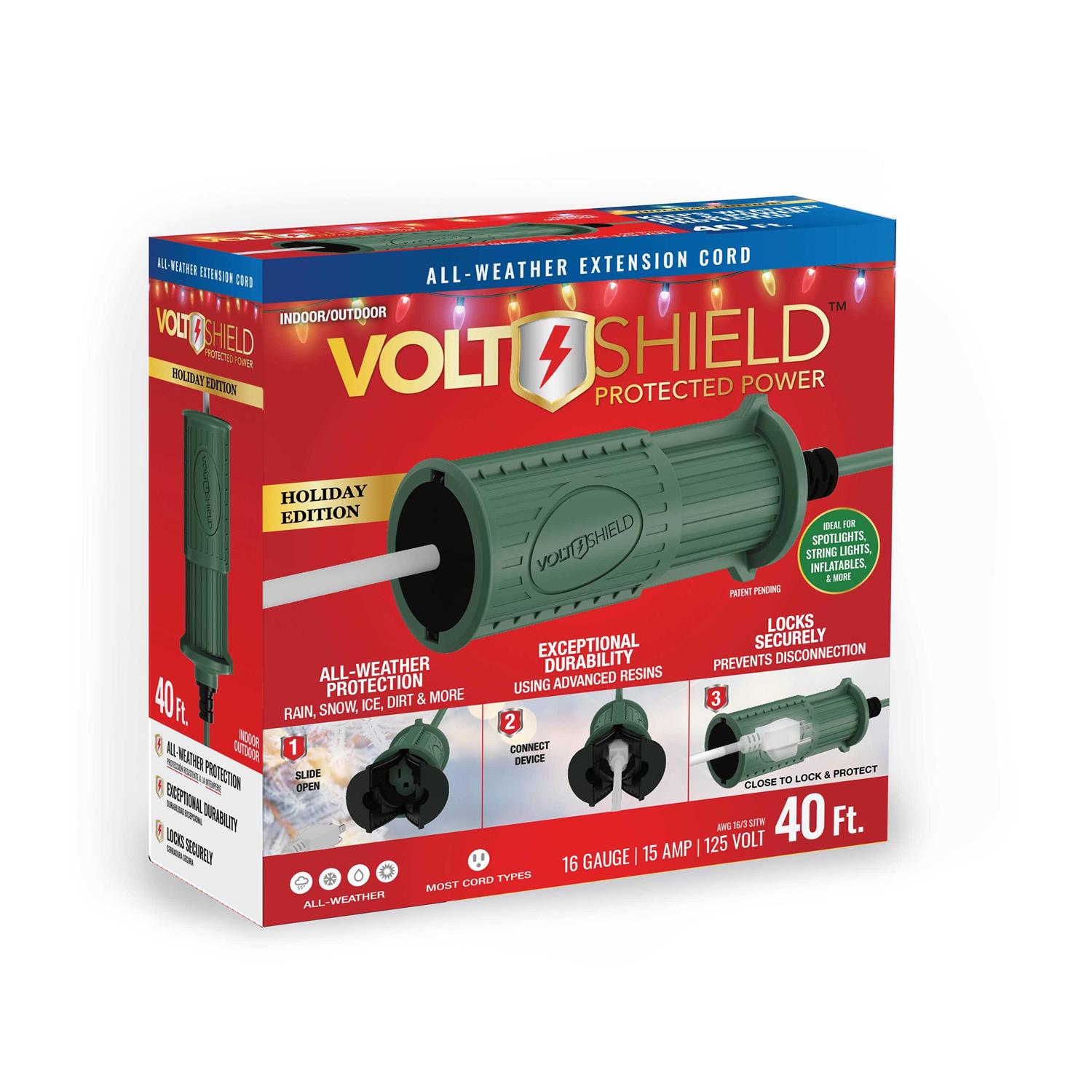 Provides all-weather protection Shields against rain, sleet, snow, ice and more Advanced resins provide exceptional durability and strength 40′ 16 Gauge Cord, 13 AMP, 125 V Locks the connection in place preventing equipment from becoming unplugged Ideal for projects around the house VoltShield is an all-in-one weather protection extension cord that shields the weather and locks the connection in place. This patented product is made from highly durable resins providing exceptional strength. Great for any job around the house and ideal for Halloween and holiday lights.