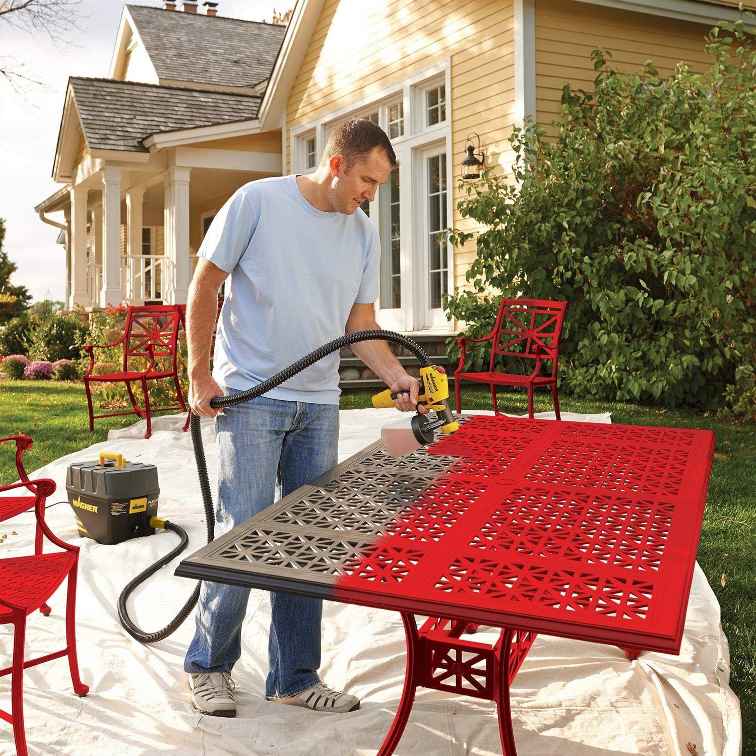 The Wagner FLEXiO 5000 paint sprayer is great for applying paint or stain on a variety of indoor and outdoor projects such as walls, ceilings, cabinets, trim, furniture and more. The sprayer includes two nozzles for added versatility. The innovative iSpray nozzle is ideal for spraying broad surfaces while the Detail Finish nozzle is ideal for fine finishing on cabinets and trim. The sprayer also features several adjustable settings to suit your project needs including an adjustable spray pattern, spray width, air power, and material flow control. The FLEXiO 5000 can also be used with a wide variety of paint and stains and even produces the power to spray unthinned materials right from the can, including paint and primer in one. The turbine base keeps the weight on the ground, not in your hand, to reduce user fatigue on big projects. The nozzles, 11.5 ft. hose and handle all fit into the X-Boost Power Box for organized storage after use.