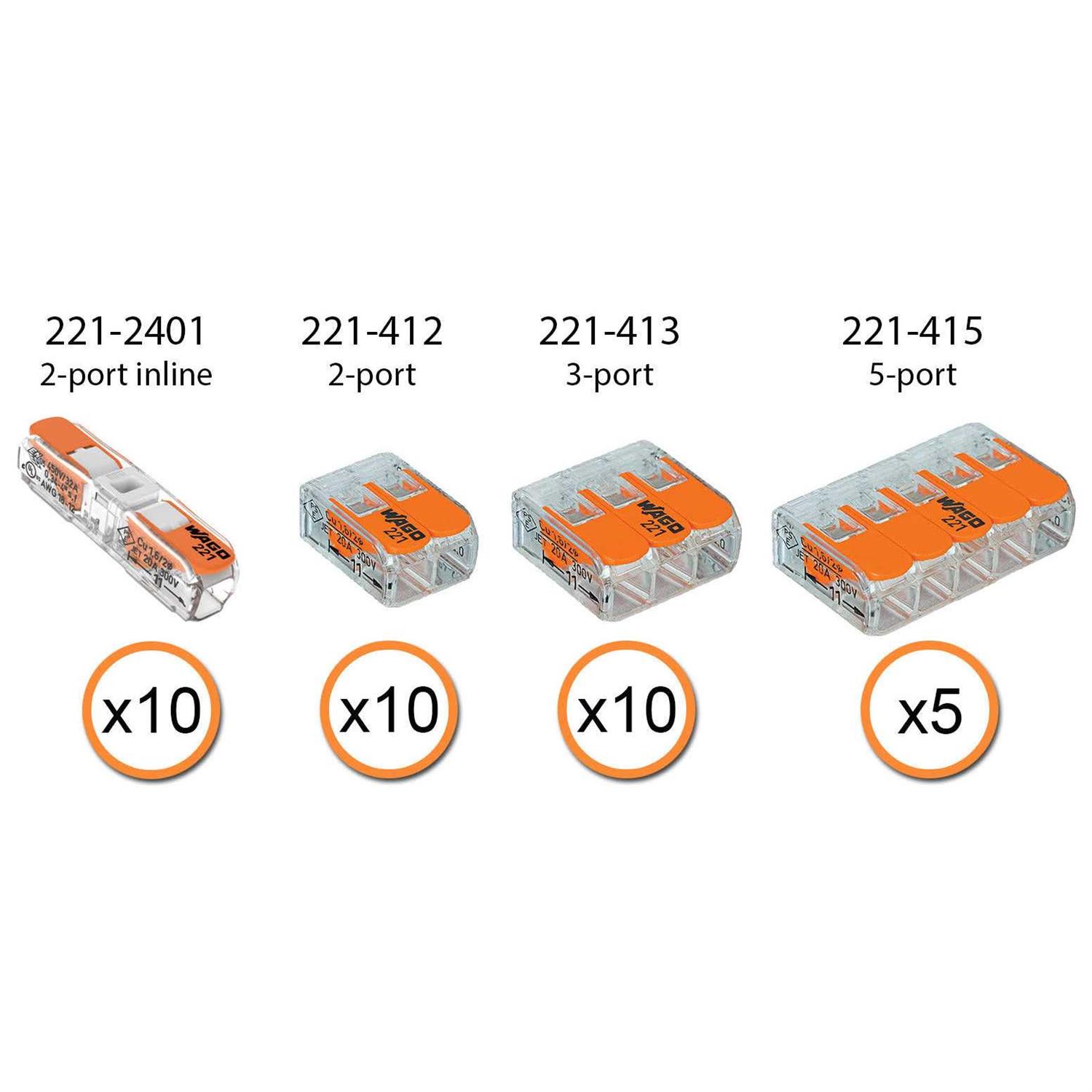 • Includes: 10x 221-2401 (2 conductor inline), 10x 221-412 (2 conductor), 10x 221-413 (3 conductor), 5x 221-415 (5 conductor) with case