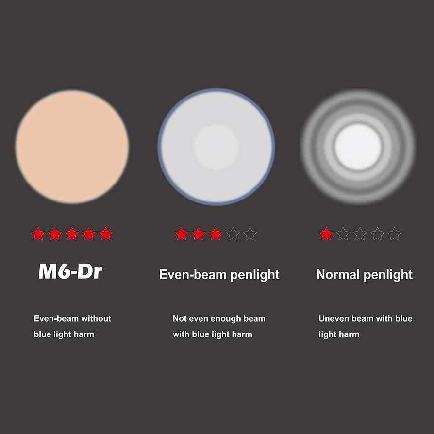 Pen Lights by Weltool. Details:Weltool M6-Dr Golden-Eyed Tiger Cub No-Glare LED Flashlight Designed with the medical professionals in mind, the M6-Dr no-glare LED flashlight features a warm white LED with 3000K color temperature and color rendering index of 85%, rivaling those of the incandescent lights. The true color rendering aids doctors in exams, avoids misdiagnosis caused by glaring light distorting skin and tissue tones. The soft even light will not disturb the doctor’s nor the patient’s vision. Using an optical glass lens with light transmission rate of over 90%, coupled with a light emitting angle of 30 degrees, the M6-Dr creates a circle of perfectly distributed even light. The area within the light circle has no dark spot, no glare, and no distracting uneven lighting anywhere. The 4.5 lumen output is perfect for the optometrist and ophthalmologist to conduct examinations. A steel clip is included as an accessory. The flashlight body is 133mm long, containing 2 AAA alkaline…
