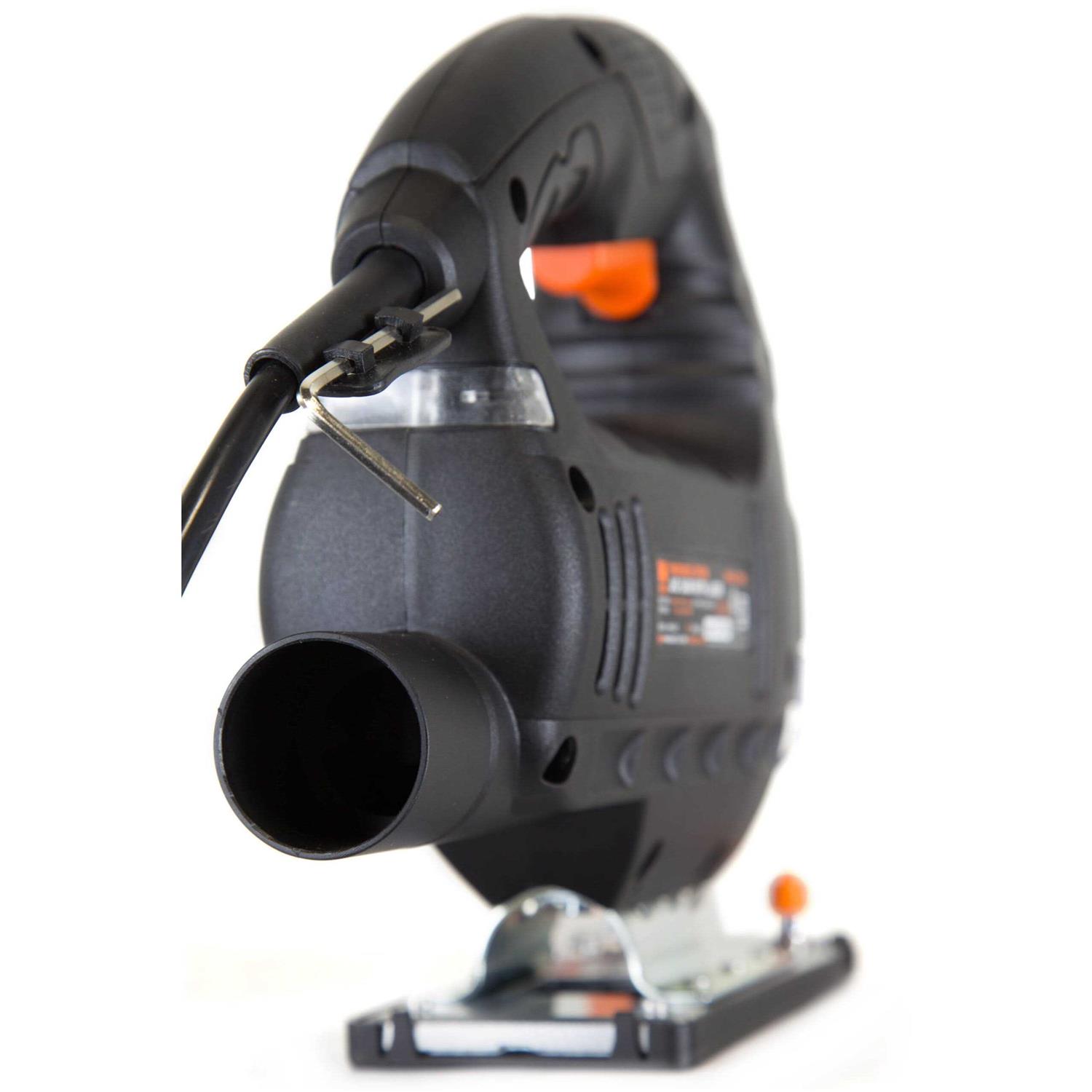 Remember when you had the ability to cut any shape you wanted all in the palm of your hand. The WEN 6.6 Amp Variable Speed Orbital Jig Saw glides through wood, metal, plastic and more, making any pattern or contour easy to achieve. The variable speed dial adjusts the stroke of the blade anywhere from 0 to 3,300 strokes per minute. Onboard laser keeps your line of cut right on target while the front mounted LED light helps illuminate your work piece. Attack wood up to 4-1/4 in. thick and metals up to 3/8 of an inch thick. The orbital selection knob helps adjust the strength of the blade to match the density of the cutting material. Simply turn the knob to change the stroke from vertical to orbital, creating a pendulum effect with the saws blade. Easily bevel the bottom footplate up to 45?? in either direction for angled cuts in your work piece. The lock-on button temporarily holds the trigger in place to alleviate the stress of keeping the trigger engaged during long jobs. Make blade changes and installation faster than ever with the tool-free quick release chuck. The onboard tool storage system ensures that any necessary hex wrenches are always close while the rear-mounted dust port allows for attachment to the dust collection device of your choice.