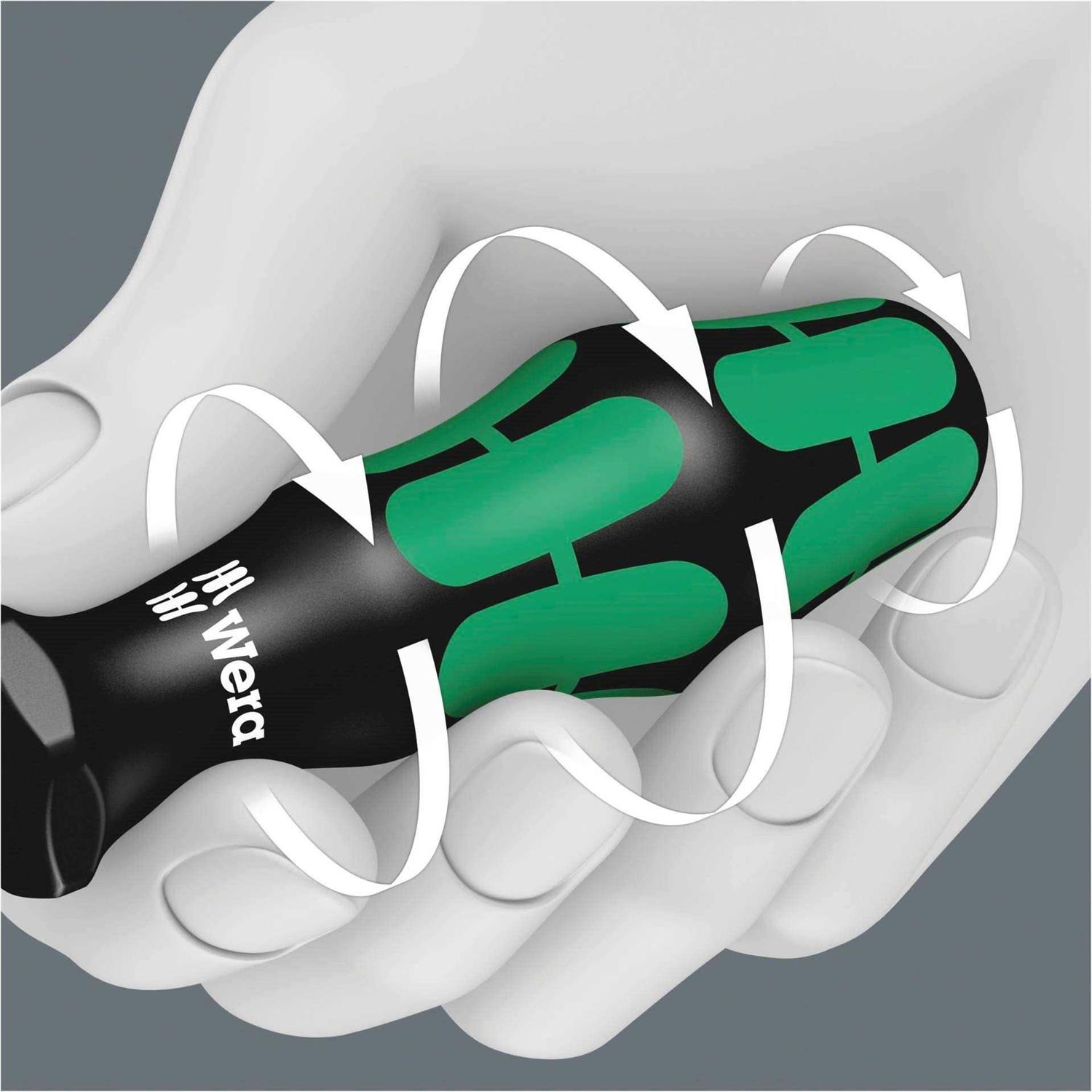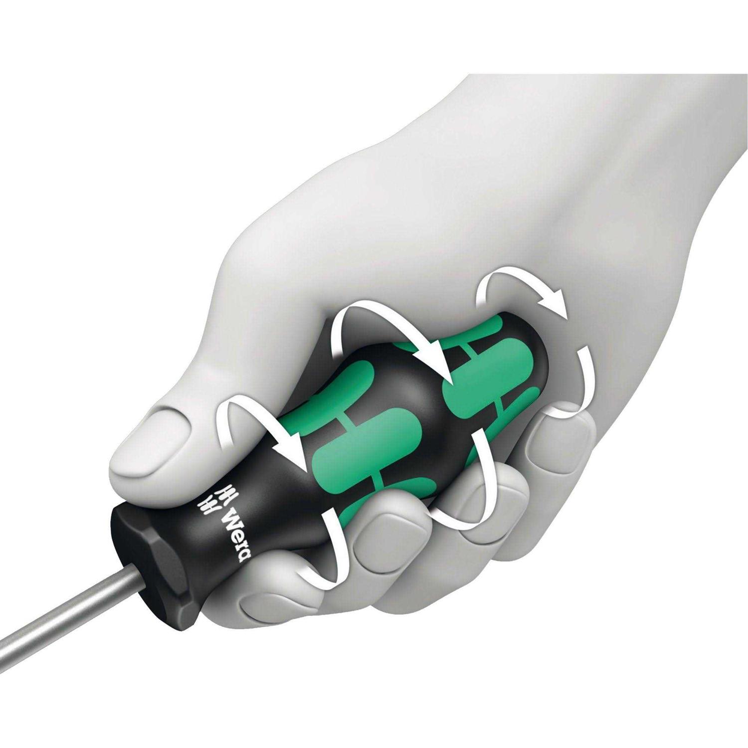 Laser Grip Tip A precisely focused laser creates a sharp-edged surface structure. This laser treatment results in an edge hardness of up to 1000 HV 0.3. Wera Lasertip bites itself into the screw head and prevents any slips out of the recess. Never Slip Again It happens time and time again that the tip slips out of the screw head when screwdriving, sometimes damaging valuable surfaces or even causing injury. The tips of the Wera Lasertip screwdrivers are microscopically roughened by means of a laser. This rough surface literally bites itself firmly into the screw head. Slipping out becomes a thing of the past. Reduce Contact Pressure Fatigue Wera Lasertip reduces the contact pressure required and enhances force transfer – meaning less screwdriving effort is required. Screwdriving becomes safer and easier. Better Ergonomics Kraftform Plus screwdrivers – ergonomics you can grasp. They relieve the entire hand-arm system even when used intensively. Along with other technical and product advantages such as the Lasertip for a secure fit in the screw head, Kraftform screwdrivers are the ideal choice whenever manual screwdriving jobs are concerned.