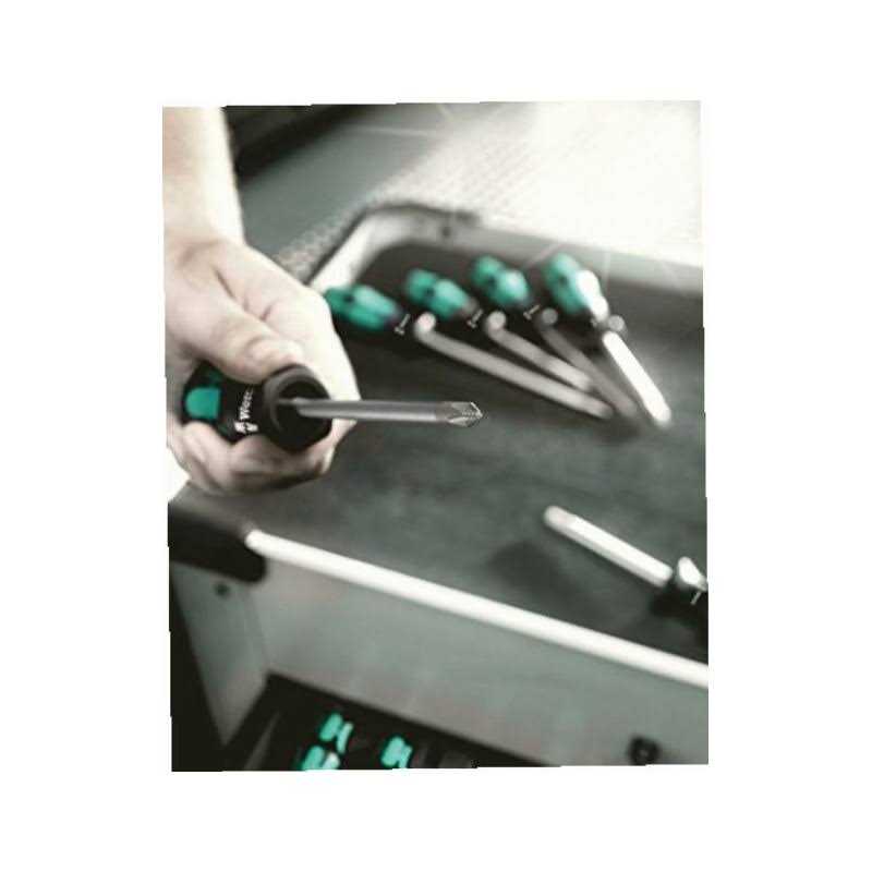 Wera Kraftform 6 Piece Screwdriver set is designed for the Professional user. Lasertip micro-rough drive tip bites into the fastener to ensure a perfect fit and reduce cam-out effect. Handle marking on top of handle includes screw symbol and size of tip to easily find the right screwdriver in your toolbox or workplace. Anti-roll protection at base of handle stops screwdrivers from rolling away at workplace. Set contains 4 Slotted – 1/8 no Lasertip 5/32 7/32 1/4 and 2 Phillips – PH1 PH2. Includes wall-mounting rack for convenient storage and tool retrieval. 22″ L x 7. 68″ W x 3. 27″ H.Hardware gt; ToolsWERA TOOLS INC.