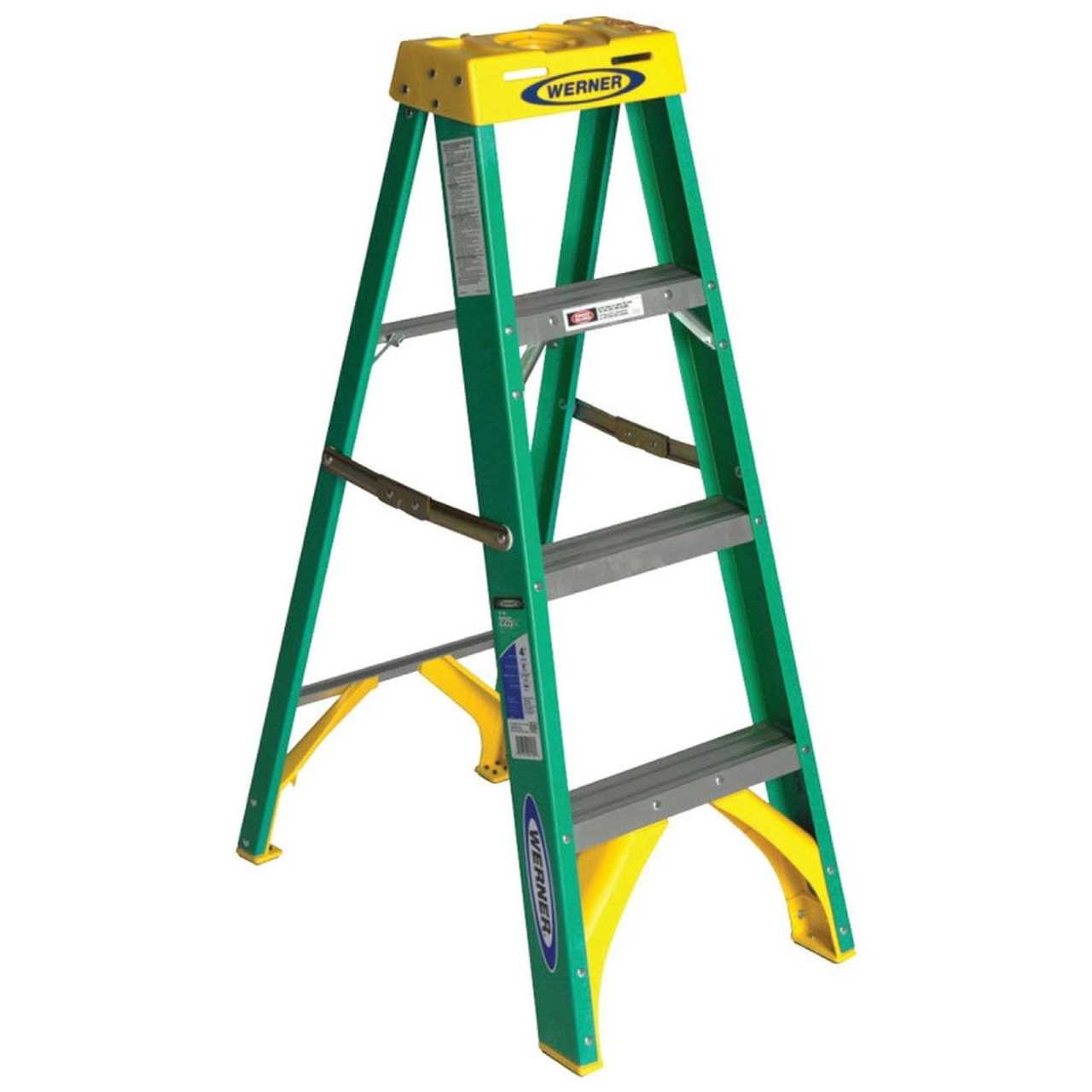 Easily reach high spaces with this stepladder from Werner. This 4 ft. fiberglass stepladder has 3 steps and a load capacity of 225 lb. Width measurements at the bottom come to 28. Added stability comes from the steps’ ribbed tread. This product is a part of the 5900 series. The spread at the base is 28-7/8 inch. With safety at the forefrontFeaturesBottom Width: 28 inch – Series: 5900ANSI Type: IIStep Depth: 3 inch – Item: Stepladder – Load Capacity: 225 lb. – Material: Fiberglass – Stepladder Item: Stepladder – Number of Steps: 3Ladder Height: 4 ft. – Ladder Tread: Ribbed – Base Spread: 28-7/8 inch Gender: unisex.