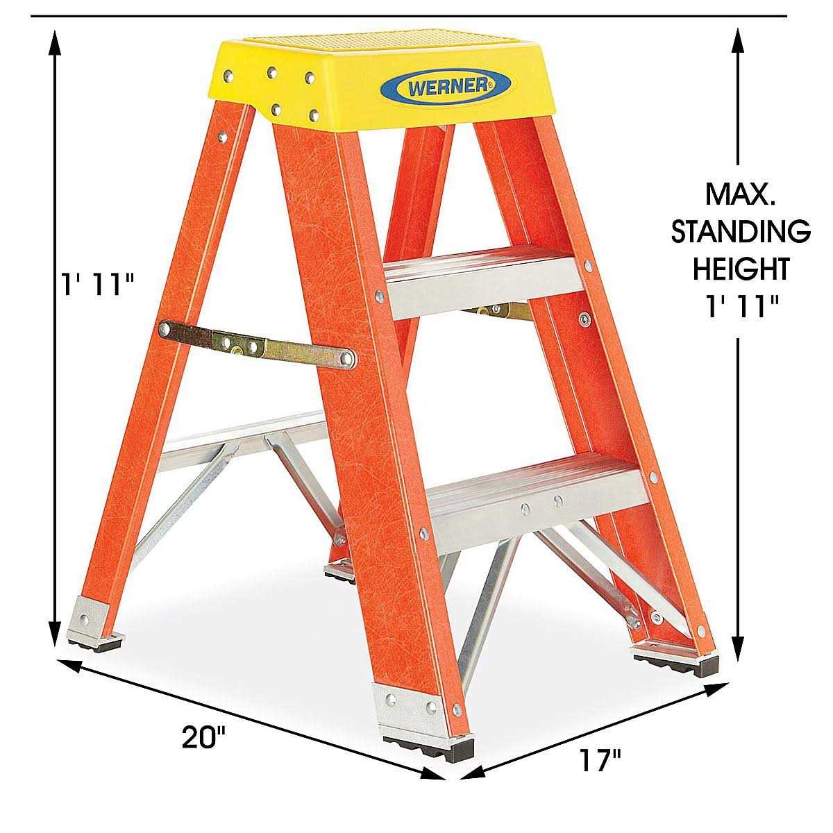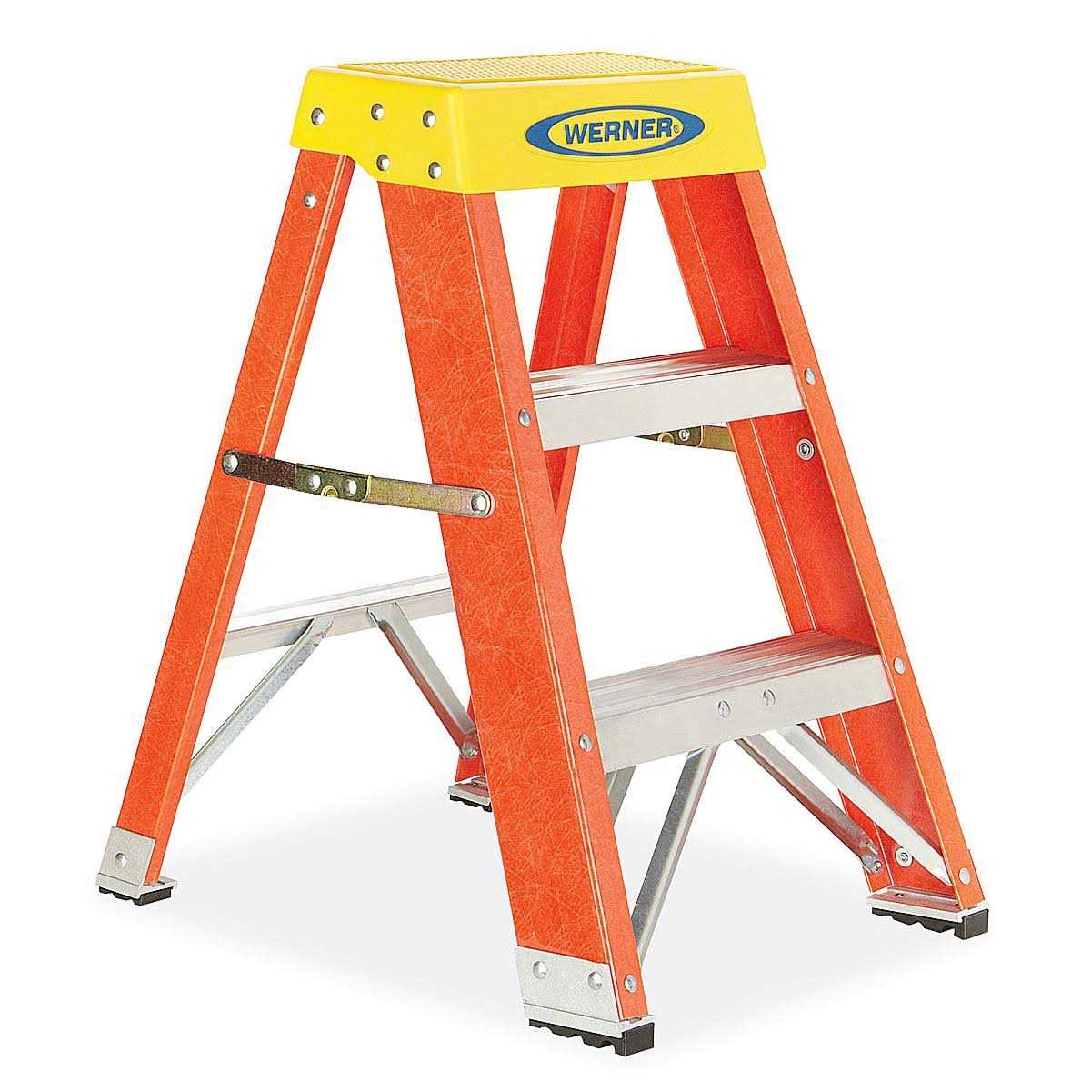 Fiberglass Step Ladders – Werner Working off the ground requires high–quality industrial ladders. Electricity safe. Fiberglass rails are non–conductive. Nonslip rubber feet. Slip–resistant 3″ steps. Reinforced edge bracing. 300 lb. capacity.