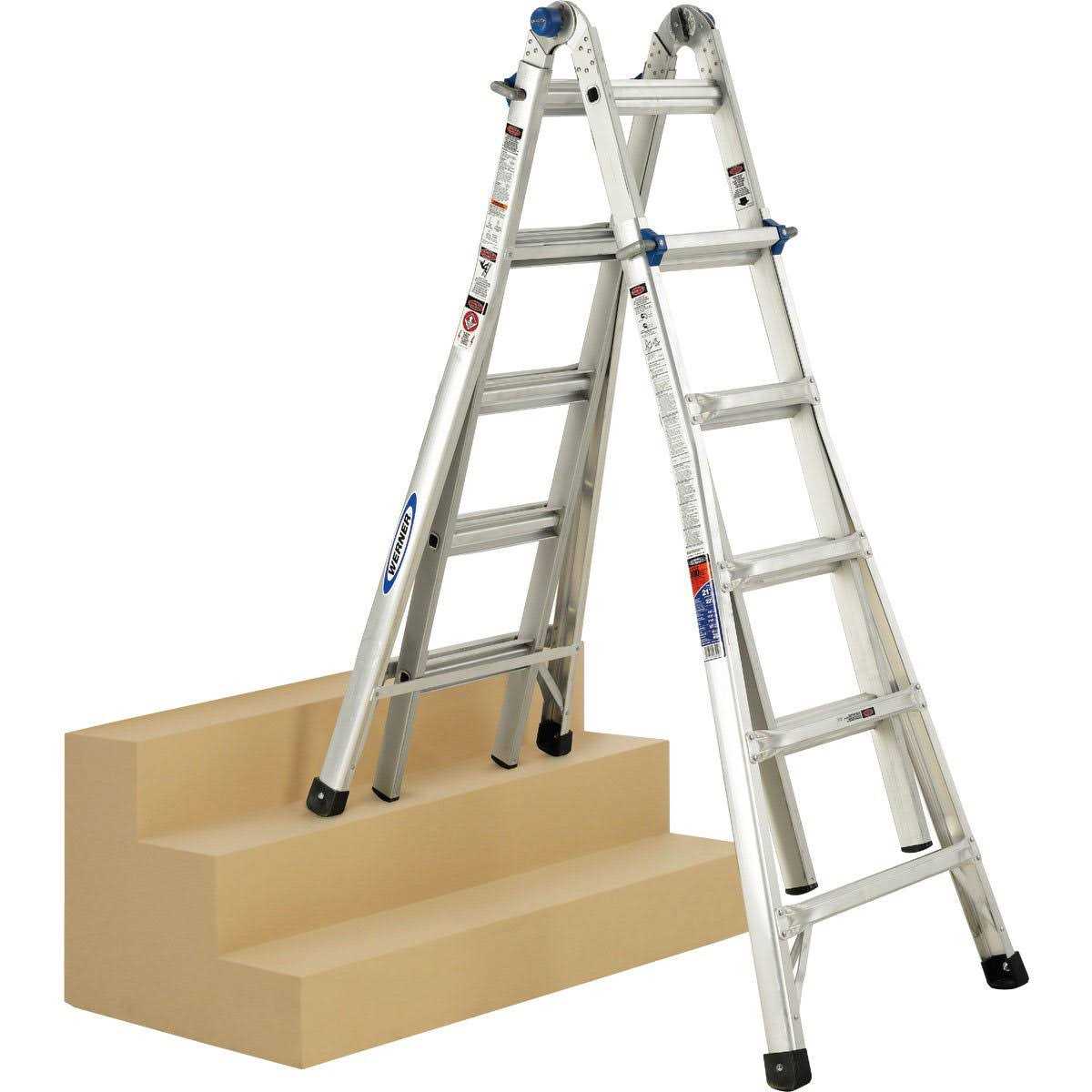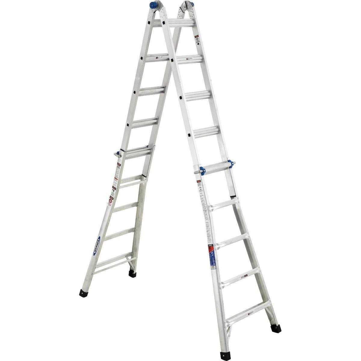 The Werner 22-feet Type 1A Telescoping MultiLadder has a total of 28 different positions for all your ladder needs. It converts easily between an extension ladder, a twin stepladder and two stairway stepladders, or it can even become two scaffold bases. This aluminum telescoping ladder weighs just 47-pounds, so it’s easy to transport where needed. The flared ladder bottom is wider than normal to give extra stability. The feet of the telescoping multi-position ladder are slip resistant to ensure a firm grip with the floor surface. Each step has double rivets for maximum safety. Extend the Werner 22-foot aluminum telescoping MultiLadder from 11-feet to 19-feet to reach wherever you need to. The curved rails allow a good grip and feel comfortable when climbing. As a stepladder, this commercial telescoping multi-ladder allows two people to work together with its duty rating of 300-pounds on each side.