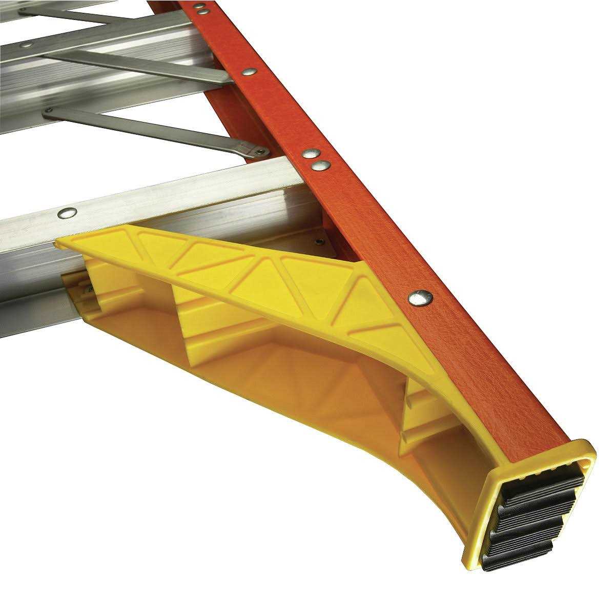 The T6208 fiberglass 8 ft twin step ladder offers a high performance dual HolsterTop with a paint and tool holder for convenience. The internal spreaders are heavy-duty and the slip-resistant TRACTION-TRED steps are all double riveted and knee braced. These twin step ladders allow 300 lb per side making them ideal for one or two person jobs. The EDGE molded brace and foot pad combination provide bracing strength and increased protection against damage. Fiberglass rails are non-conductive for working near electricity.