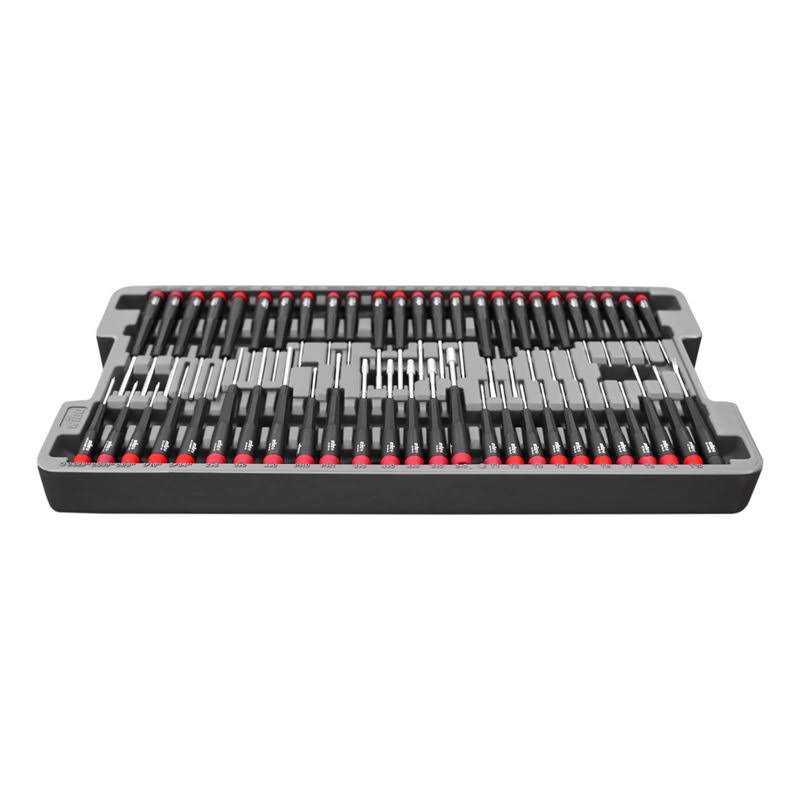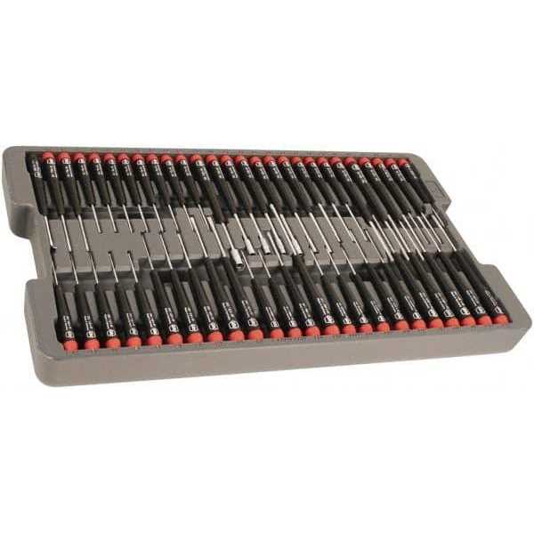 51 piece precision set in molded tray storage includes: Slotted: 0.8, 1.0, 1.2, 1.5, 1.8, 2.0, 2.5, 3.0, 3.5, 4.0mm. Phillips: #000, #00, #0, #1. Hex Metric: 1.3, 1.5, 2.0, 2.5, 3.0, 4.0mm. Hex Inch: 0.028″ (0.71 mm), 0.035″ (0.89 mm), 0.050″ (1.27 mm), 1/16, 5/64, 3/32, 7/64, 1/8, 9/64, 5/32″. Torx: T1, T2, T3, T4, T5, T6, T7, T8, T9, T10. Nut Drivers (nutdrivers): 1.5, 1.8, 2.0, 2.5, 3.0, 4.0, 4.5, 5.0, 5.5mm. Chip Lifter: 1.0 x 2.0mm. Tray 11.5″ x 20″ x 2.25″.