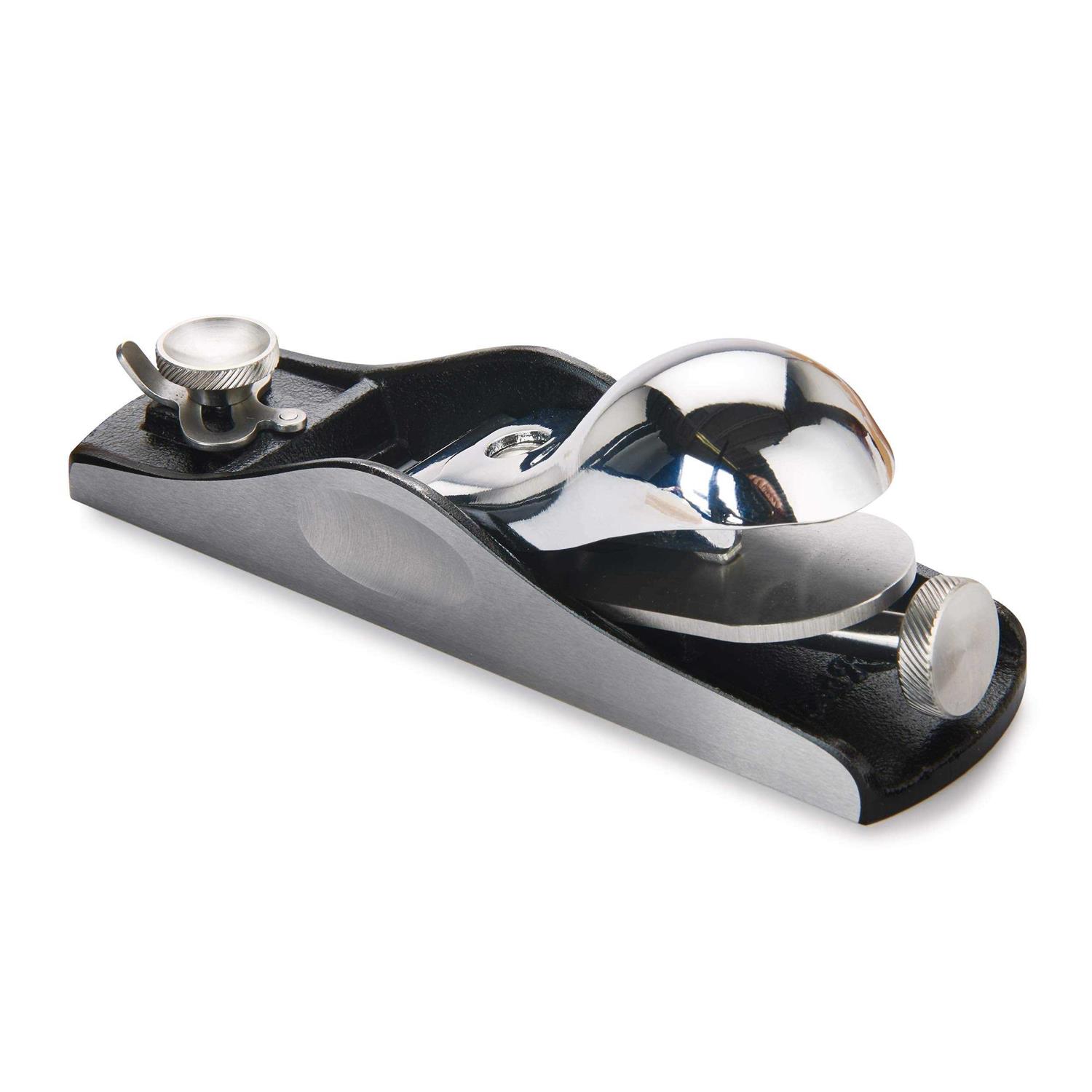 The WoodRiver Block Plane is based on the venerable Stanley #65 low angle and #18 standard angle Knuckle Cap design, generally considered one of best block plane designs around. With the widely recognized comfortable chrome plated Knuckle Cap, these block planes look like the standard and low angle versions of yester year. Upon closer inspection youll notice changes to the base castings which not only strengthen historically weak points of the original design, but also improve the blade bedding area. Improved blade adjustment mechanisms allow for crisp, easy adjustment of the blades using the rear adjustment knob. The adjustable mouth is very smooth to operate and allows fine tuning of the mouth for work ranging from coarse to creating whisper thin shavings. The stress relieved ductile iron castings are precision machined, flat and square. Each plane is outfitted with a high carbon tool steel tool blade, which is hardened to Rc60-64 for maximum edge retention and ground to a 25 bevel.