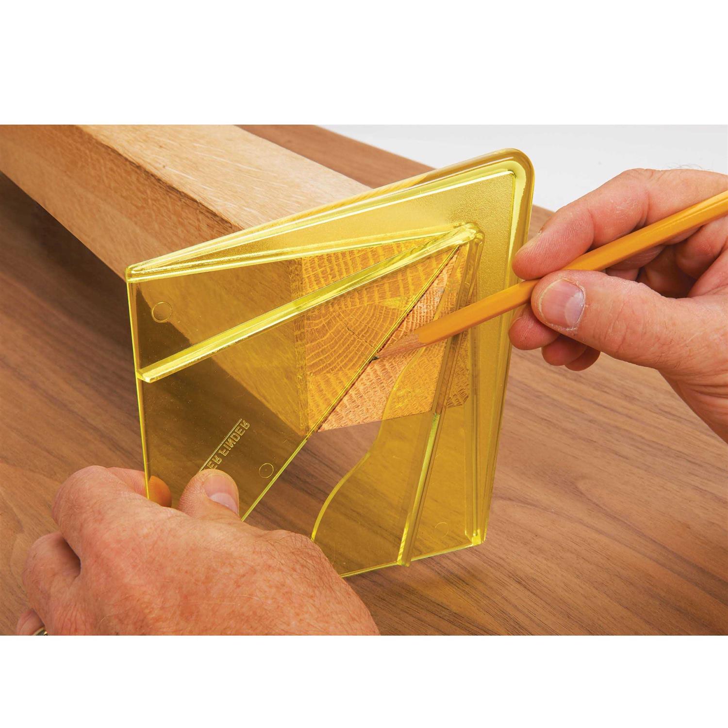 Quickly, easily, and accurately determines center for round or square stock up to 8 inch in diameter and hexagons up to 5-3/4 inch in diameter. Place the plastic center finder over the end of the piece, scribe a line, rotate the center finder about 90 degrees and scribe a second line. The intersecting lines define the workpiece center.