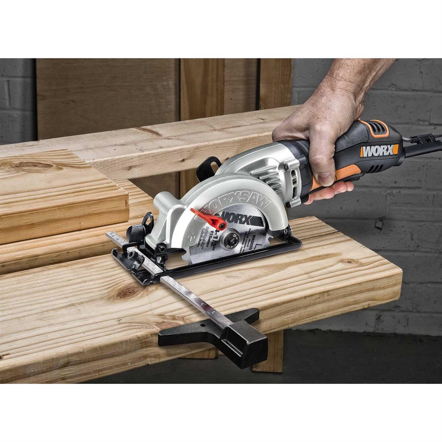 The WORXSAW is substantial enough to cut through nominal 2 in lumber yet light enough for the DIYer to easily and comfortably maneuver. Cut wood metal tile or plastic with ease. Finally there’s an alternative to the big and bulky 7-1/4 in full-sized circular saw. The cutting depth and bevel angle adjustments will accommodate nearly any DIY project. The 4-1/2 in powerful portable saw is ideal for DIY projects around the house and your workshop. The 4-1/2 in powerful portable saw is ideal for DIY projects around the house and your workshop. Cut 2 x 4’s in a single pass with an easily maneuverable compact saw that weighs 50% less than a traditional 7-1/4 in circular saw. The thin blade makes for less tool strain resulting in full size circular saw cutting speed and performance.