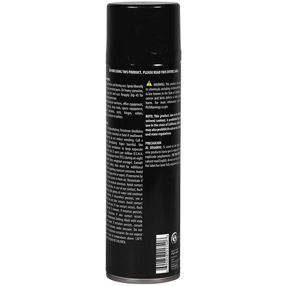Zep 45 dramatically reduces friction to provide a continuous wear-resistant film that lubricates and protects moving parts. It penetrates quickly to loosen parts that are frozen due to wear, corrosive action or build-up of grease or grime. It works on surfaces that slip, slide, rub, roll, move, turn, twist or pivot in hotels, motels, machinery manufacturers, building materials dealers, repair companies, vending machine companies, recreation facilities and offices. It is an advanced formulation of specialized oils blended with micron-sized PTFE for added lubricity. Zep 45 is non-flammable, according to the CSMA Flame Extension Test, unlike many penetrating lubricants.